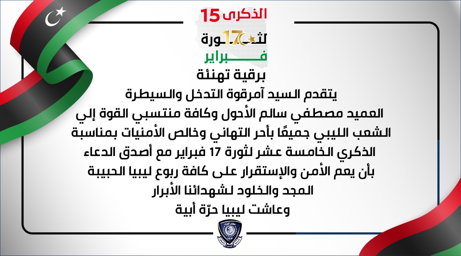 بمناسبة الذكرى الخامسة عشرة لثورة 17 فبراير، يتقدّم آمر قوة التدخل والسيطرة، العميد مصطفى سالم الأحول، بأسمى التهاني للشعب الليبي، سائلًا الله دوام الأمن والإستقرار للوطن.