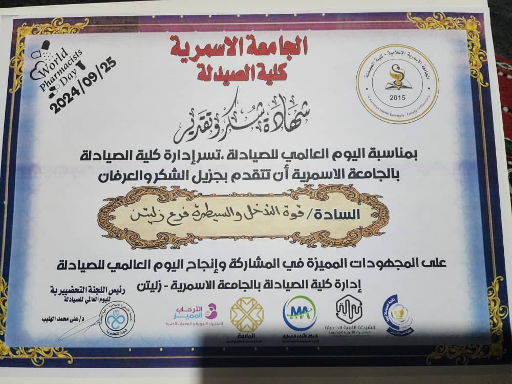 مكتب زليتن في تنظيم وتامين اليوم العالمي للصيادلة الذي اقامته كليه الصيدلة بالجامعة الأسمرية .