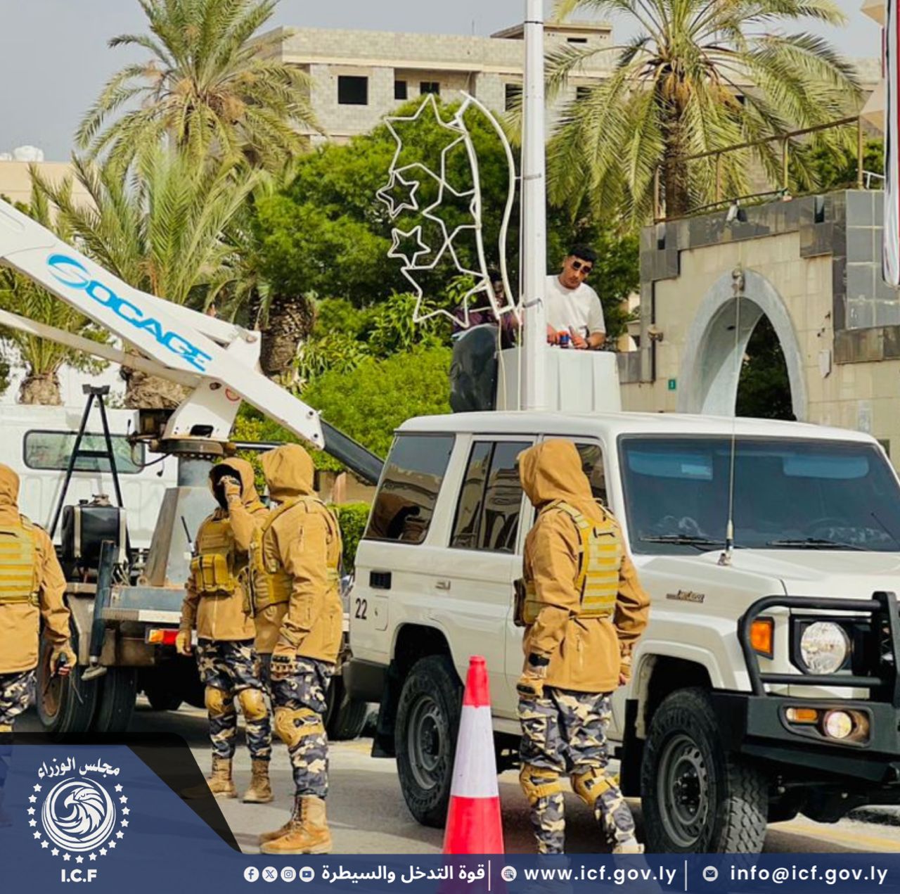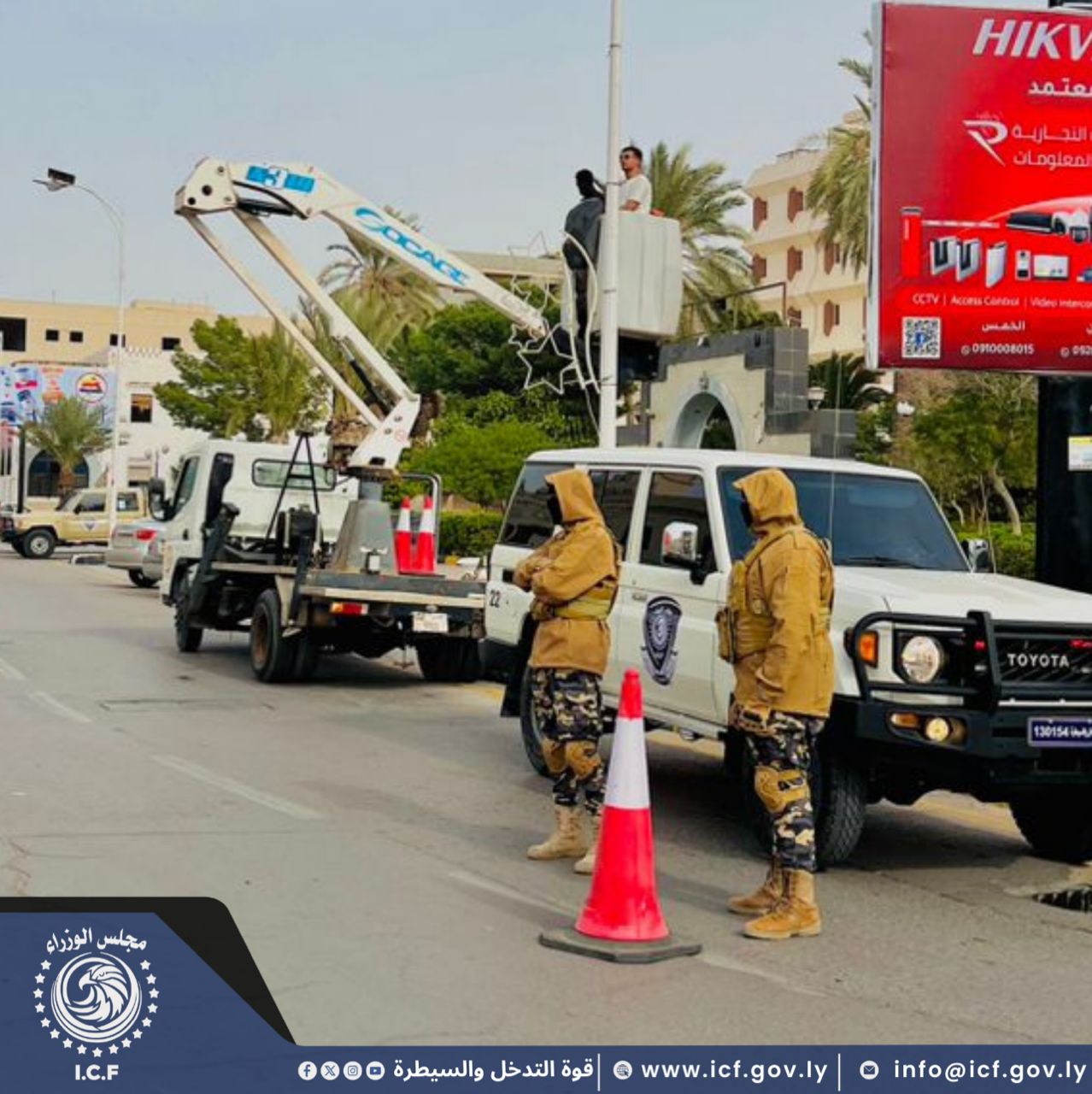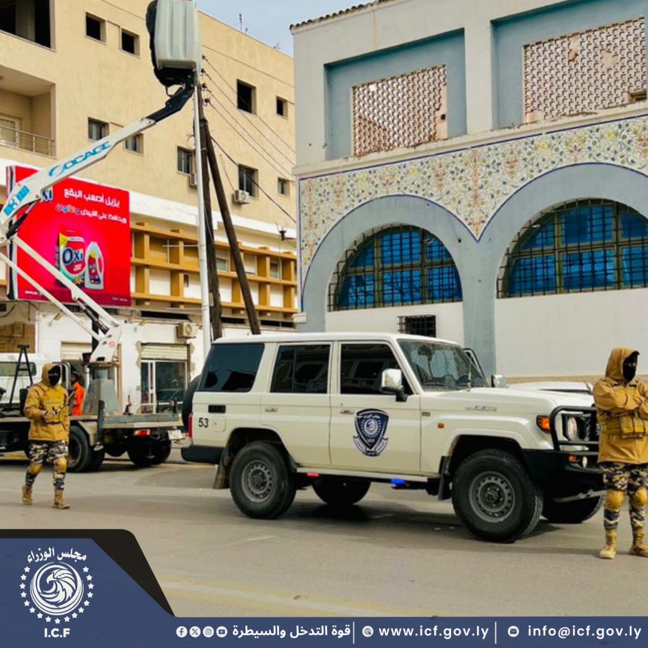 قوة التدخل والسيطرة تأمن أعمال شركة الأشغال العامة أثناء تركيب رايات الدولة والإنارة بعدة شوارع ، إستعدادًا للإحتفال بالذكرى الخامسة عشرة لثورة السابع عشر من فبراير.