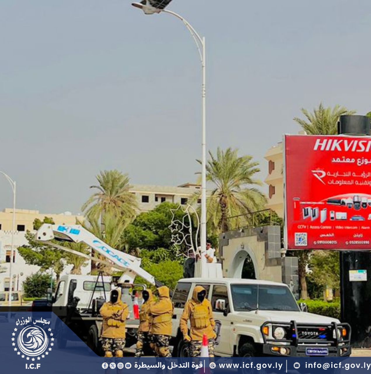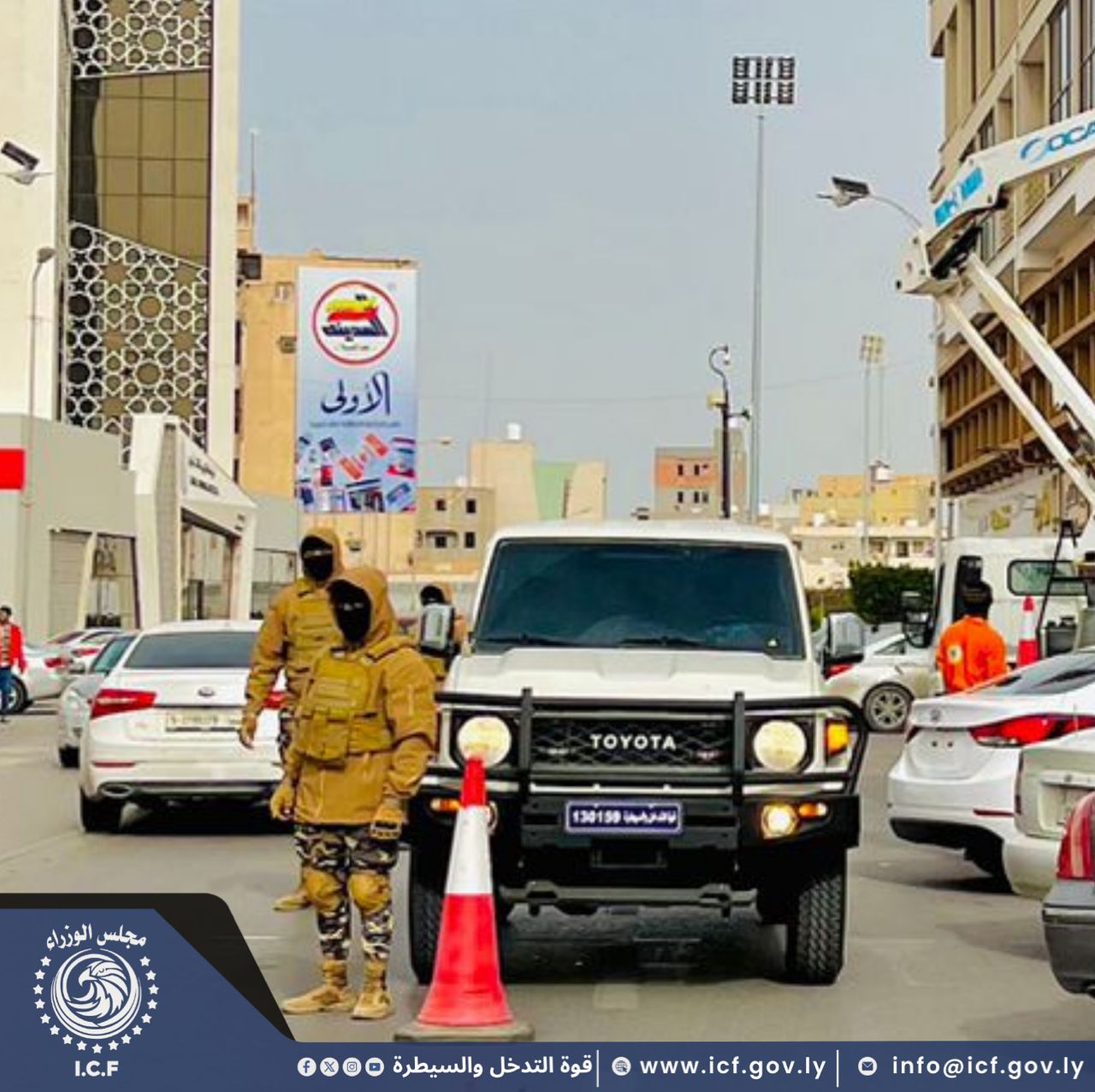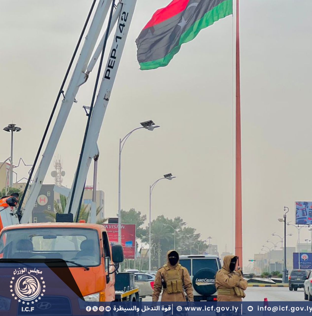 قوة التدخل والسيطرة تأمن أعمال شركة الأشغال العامة أثناء تركيب رايات الدولة والإنارة بعدة شوارع ، إستعدادًا للإحتفال بالذكرى الخامسة عشرة لثورة السابع عشر من فبراير.